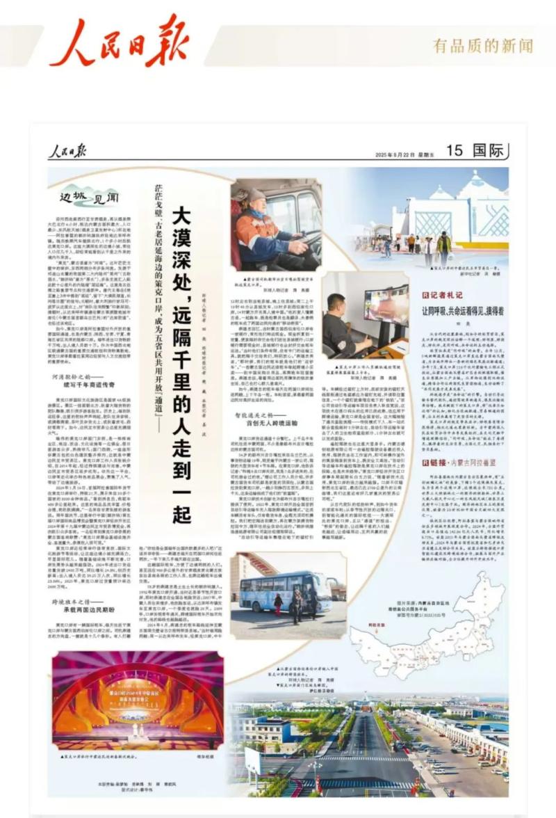 8月22日,《人民日報(bào)》國際版“邊城見聞”專欄整版聚焦阿拉善盟策克口岸,以小故事小切口,見證阿拉善盟與周邊經(jīng)貿(mào)往來、人文交流的生動實(shí)踐,展示了阿拉善盟高水平對外開放取得的豐碩成果,唱響了一曲親誠惠容行大道、命運(yùn)與共開新篇的贊歌。全文如下: