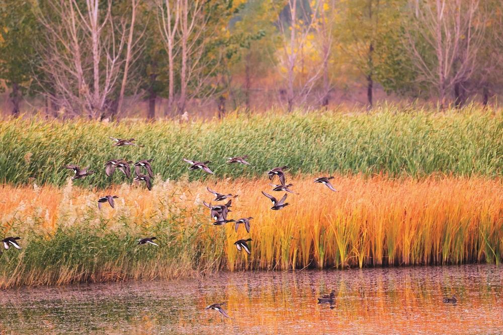 沿著黃河岸邊的公路前行,不遠處便是龍游灣國家濕地公園。這里的秋景更是別有一番風(fēng)味。樹木褪去了翠綠,換上了耀眼的金黃,廣袤的田野里,一捆捆草垛錯落有致地散布在草地上,訴說著豐收的喜悅。遠處的蘆葦蕩與天際線相連,蘆葦花在風(fēng)中輕舞,時而聚攏、時而散開,與水面上掠過的水鳥構(gòu)成靈動的剪影。林間的候鳥也多了起來,一群群白鷺在水面上盤旋,偶爾俯沖下去,叼起一條小魚,然后又展翅飛向遠方,給這片寧靜的濕地增添了幾分生機與活力。