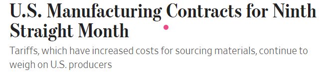 《華爾街日報》1日發(fā)表文章稱,美國供應(yīng)管理協(xié)會(ISM)當(dāng)天公布的調(diào)查報告顯示,11月美國制造業(yè)采購經(jīng)理人指數(shù)(PMI)已低于50的榮枯分界線。美國制造業(yè)活動連續(xù)第九個月萎縮,而美國制造商認為這主要是因為美國政府的關(guān)稅政策。