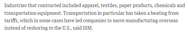 文章指出,美國制造業(yè)活動萎縮的行業(yè)主要包括服裝、紡織品、紙制品、化工產(chǎn)品和運輸業(yè)。文章表示,雖然當(dāng)前美國工廠產(chǎn)量有所增加,但未售出的庫存卻急劇增加。需求增長放緩,這在出口市場體現(xiàn)尤為明顯,而受關(guān)稅影響,出口市場的前景更加暗淡。