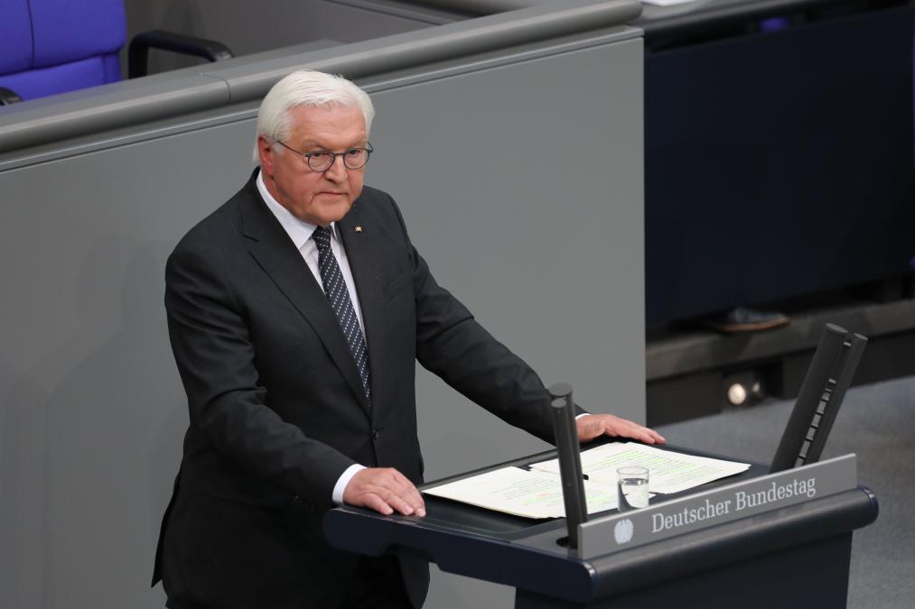 5月8日,德國總統(tǒng)施泰因邁爾在首都柏林國會大廈舉行的紀(jì)念活動上致辭。新華社記者杜哲宇攝