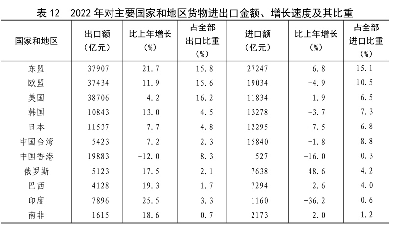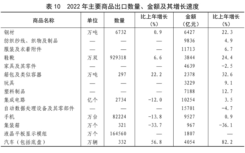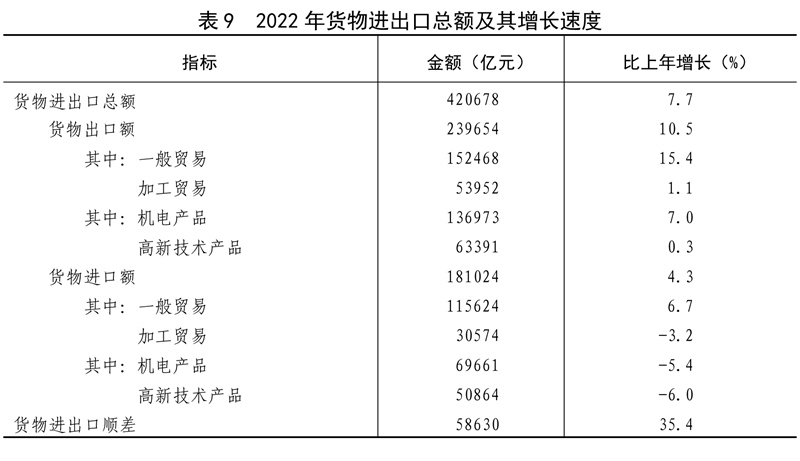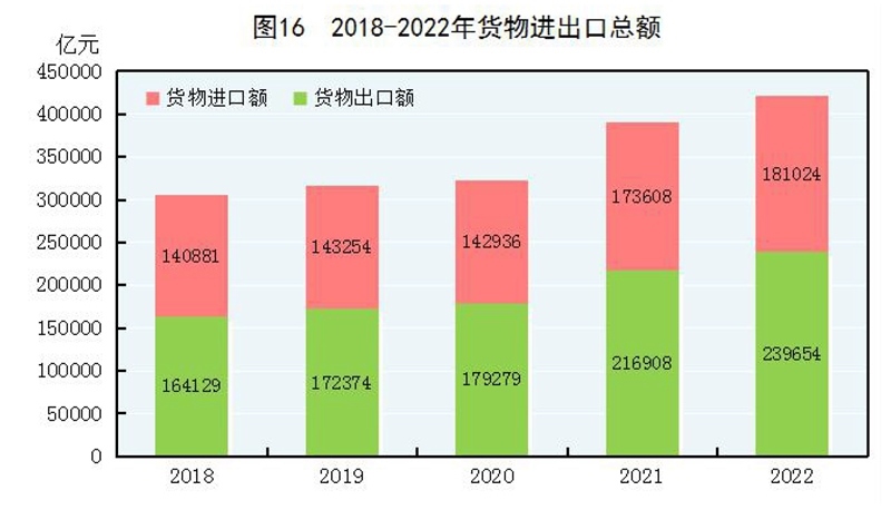 全年貨物進(jìn)出口總額420678億元,比上年增長7.7%。其中,出口239654億元,增長10.5%;進(jìn)口181024億元,增長4.3%。貨物進(jìn)出口順差58630億元,比上年增加15330億元。對“一帶一路”[40]沿線國家進(jìn)出口總額138339億元,比上年增長19.4%。其中,出口78877億元,增長20.0%;進(jìn)口59461億元,增長18.7%。對《區(qū)域全面經(jīng)濟伙伴關(guān)系協(xié)定》(RCEP)其他成員國[41]進(jìn)出口額129499億元,比上年增長7.5%。