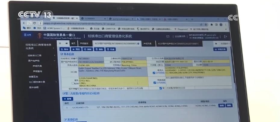 當日,廣西桂林一家紡織企業(yè)通過國際貿(mào)易“單一窗口”申報,為一批出口到菲律賓的貨物自主出具了廣西首份RCEP原產(chǎn)地聲明,貨值約9萬元,在菲律賓享受關稅優(yōu)惠約1.3萬元。2022年,這家紡織企業(yè)作為海關高級認證企業(yè),率先認證成為廣西紡織領域首家“經(jīng)核準出口商”。