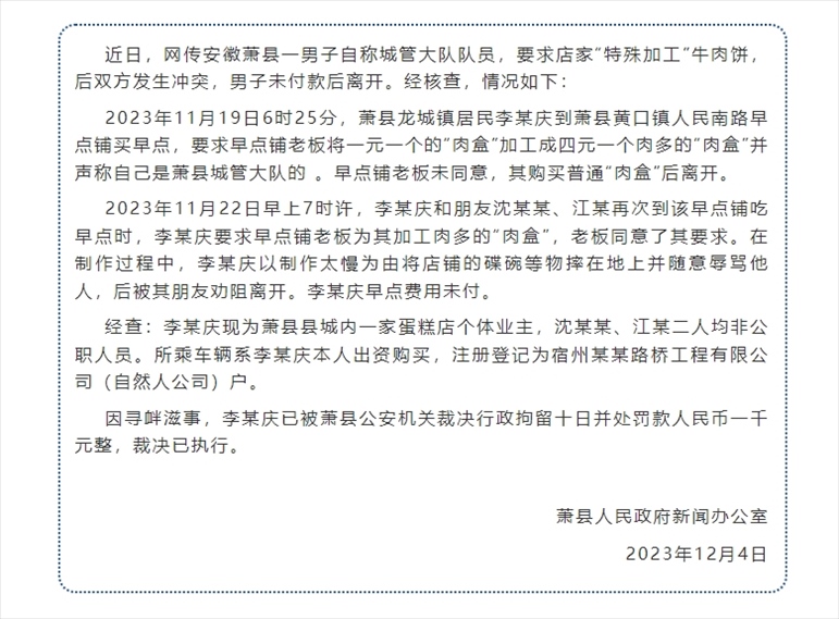 ·安徽蕭縣官方通報(bào)男子冒充城管要免費(fèi)加肉:拘留10日。