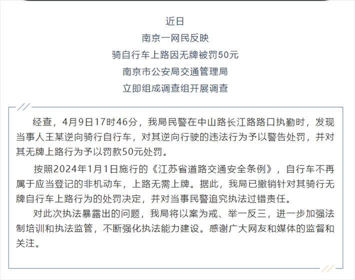 ·南京交警回應市民騎自行車無牌被罰50元:撤銷處罰,追究民警責任。