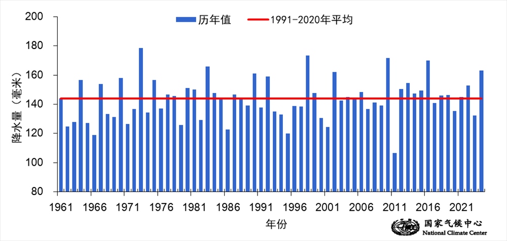 圖3 1961-2024年春季全國(guó)平均降水量歷年變化(單位:毫米)