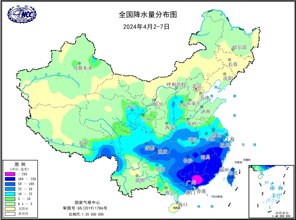 14次區(qū)域暴雨過程襲擊我國(guó),較常年同期明顯偏多。春季,我國(guó)共發(fā)生14次區(qū)域暴雨過程,較常年同期偏多3.8次。4月2-7日的暴雨過程為1961年以來同期第八強(qiáng),受其影響,我國(guó)華東南部、華中南部、華南東部及貴州東北部、重慶、四川中東部等地累計(jì)降水量50~100毫米,浙江西南部、福建、江西南部、湖南東南部、廣東大部等地累計(jì)降水量100~250毫米,局地超過250毫米(圖5);湖南茶陵(203.2毫米)、廣東始興(145.3毫米)日降水量超過極端閾值。