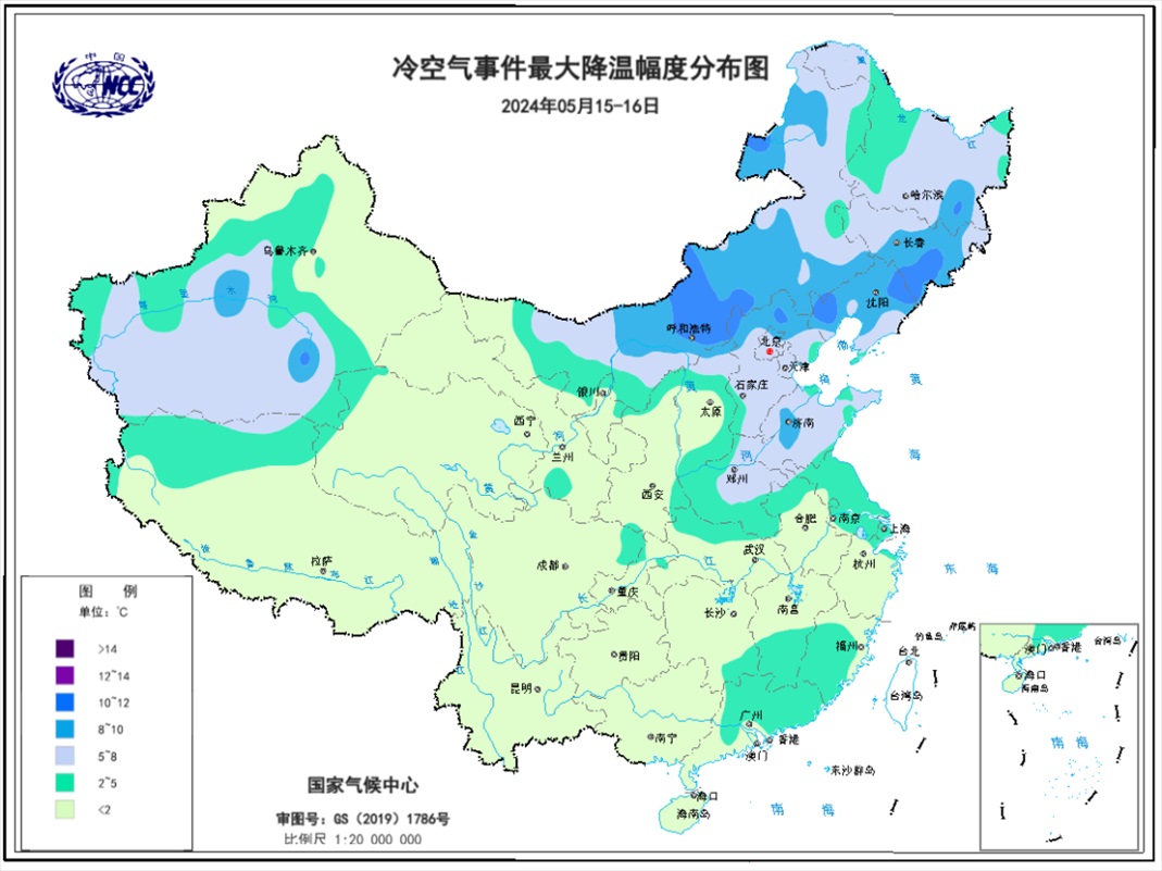 圖8 2024年5月15-16日全國(guó)最大降溫幅度分布圖