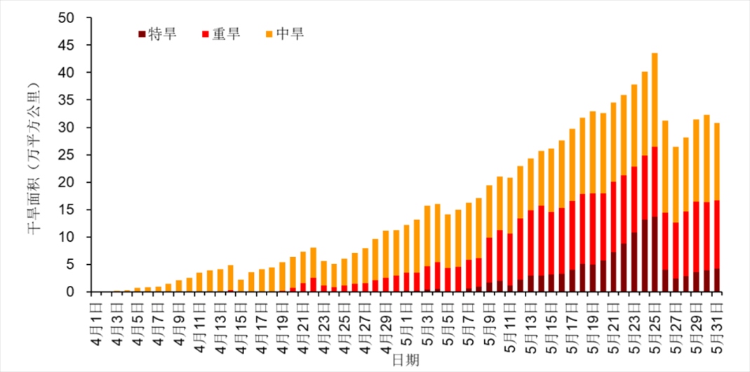 西南地區(qū)冬春連旱緩解,黃淮江淮干旱露頭發(fā)展。今年以來由于溫高雨少,我國(guó)西南地區(qū)出現(xiàn)冬春連旱,4月17日重旱及以上面積(32.6萬平方公里)、特旱面積(13萬平方公里)達(dá)到峰值。進(jìn)入5月后出現(xiàn)多次降水過程,冬春連旱緩解。4月以來,黃淮、江淮等地氣象干旱開始露頭并發(fā)展。至5月25日,中旱及以上等級(jí)干旱面積(43.6萬平方公里)和特旱面積(13.7萬平方公里)均達(dá)最大(圖6)。目前,黃淮中部、江淮北部、江漢東部等地仍存在中度及以上等級(jí)氣象干旱。5月31日,魯豫皖蘇鄂五省中旱以上干旱面積30.8萬平方公里,其中重旱12.4萬平方公里,特旱4.3萬平方公里(圖7)。