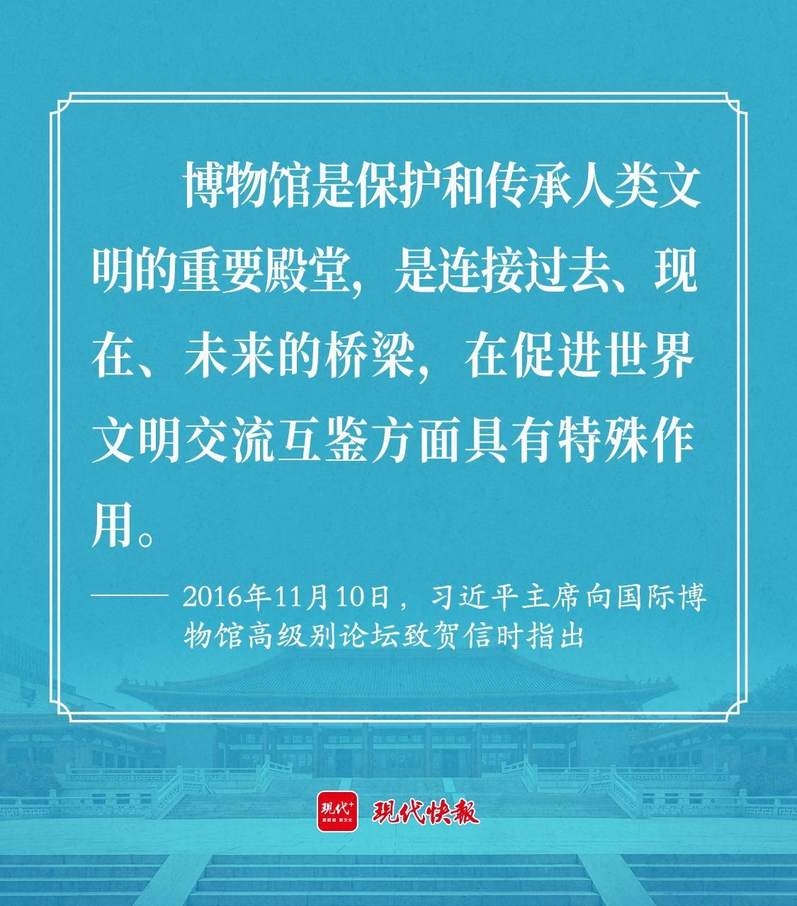 2016年11月10日,習近平主席向國際博物館高級別論壇致賀信時指出,博物館是保護和傳承人類文明的重要殿堂,是連接過去、現(xiàn)在、未來的橋梁,在促進世界文明交流互鑒方面具有特殊作用。