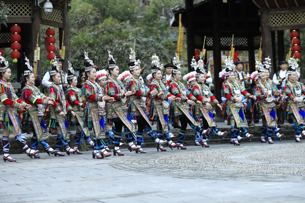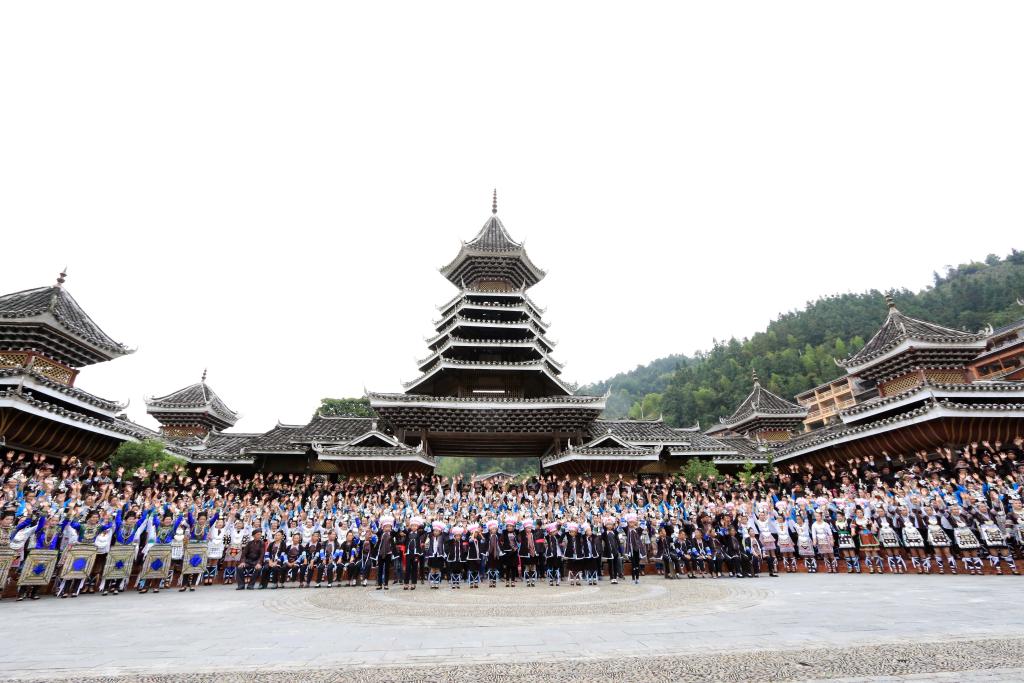 侗族群眾近日在黎平縣肇興侗寨寨門前演唱侗族大歌。楊代富 攝