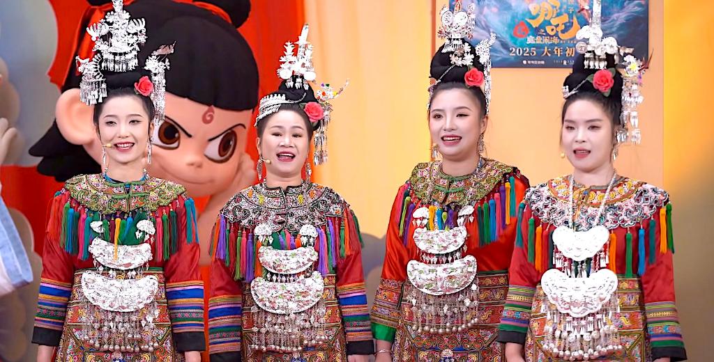 近日,貴州“舞樂(lè)蟬歌”樂(lè)團(tuán)的成員們,在電影《哪吒之魔童鬧?!返男麓呼[海直播現(xiàn)場(chǎng)表演侗族大歌。(受訪者供圖)