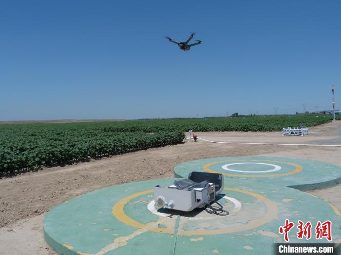 6月28日,新疆石河子市一片棉田中,遙感監(jiān)測(cè)作物長(zhǎng)勢(shì)的無(wú)人機(jī)巡檢返回?!≮w婧姝 攝