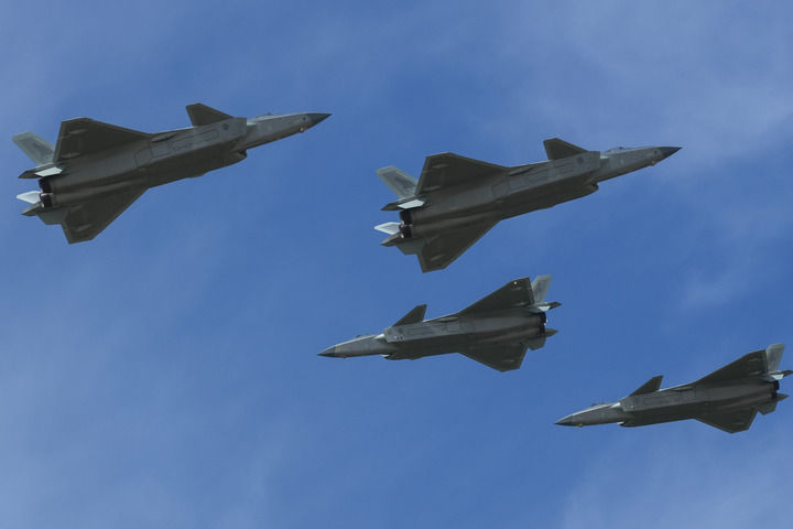 ↑9月19日,殲-20進行四機編隊機動飛行展示。新華社記者 許暢 攝