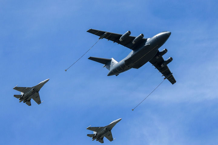 ↑9月19日,運油-20A和殲-16編隊通場。新華社記者 顏麟蘊 攝