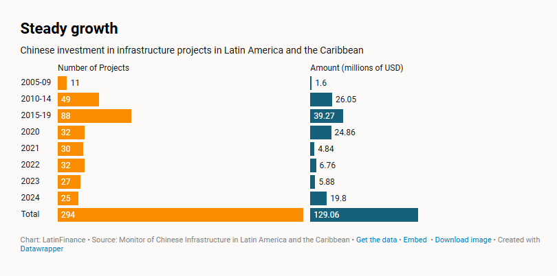 中國(guó)在拉丁美洲和加勒比地區(qū)投資基礎(chǔ)設(shè)施項(xiàng)目(來源:《拉美金融》)