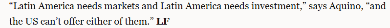文章指出,并非所有人都對(duì)拉美與中國(guó)之間的合作感到滿意。華盛頓尤其擔(dān)心。不過,許多人認(rèn)為華盛頓影響拉丁美洲的能力有限。文章援引利馬國(guó)立圣馬科斯大學(xué)的亞洲經(jīng)濟(jì)專家卡洛斯·阿基諾的話指出,“拉丁美洲需要市場(chǎng)和投資,但美國(guó)無法提供其中任何一項(xiàng)”。