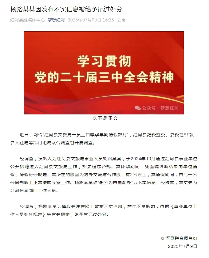 經(jīng)調(diào)查,發(fā)帖人為紅河縣文旅局事業(yè)人員楊路某某,于2024年10月通過(guò)紅河縣事業(yè)單位公開(kāi)招聘進(jìn)入紅河縣文旅局工作,招錄程序合規(guī)。其懷孕期間,憑醫(yī)院診斷結(jié)果向單位請(qǐng)假,請(qǐng)假符合規(guī)定。其所在的股室為對(duì)外交流與合作股,有2名職工,其請(qǐng)假期間,由另一名合同制職工正常接轉(zhuǎn)股室工作。楊路某某稱“老公為市里副處”為不實(shí)信息,經(jīng)核實(shí),其丈夫?yàn)榧t河州某部門工作人員。