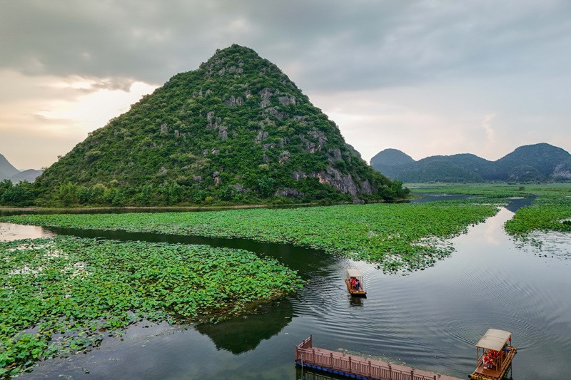 盛夏時節(jié),云南省文山壯族苗族自治州丘北縣普者黑景區(qū)內萬畝荷花初綻,碧葉連天,與獨特的喀斯特峰林、清澈湖泊繪就一幅獨具特色的山水畫卷,吸引八方游客紛至沓來。
