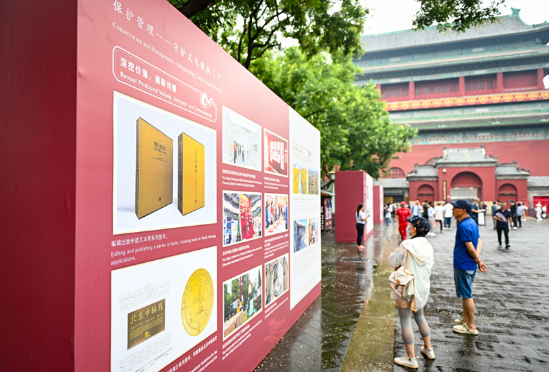 7月27日,人們在北京鐘鼓樓廣場上觀看介紹北京中軸線申遺成功一周年成果的展板。