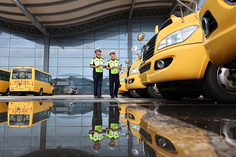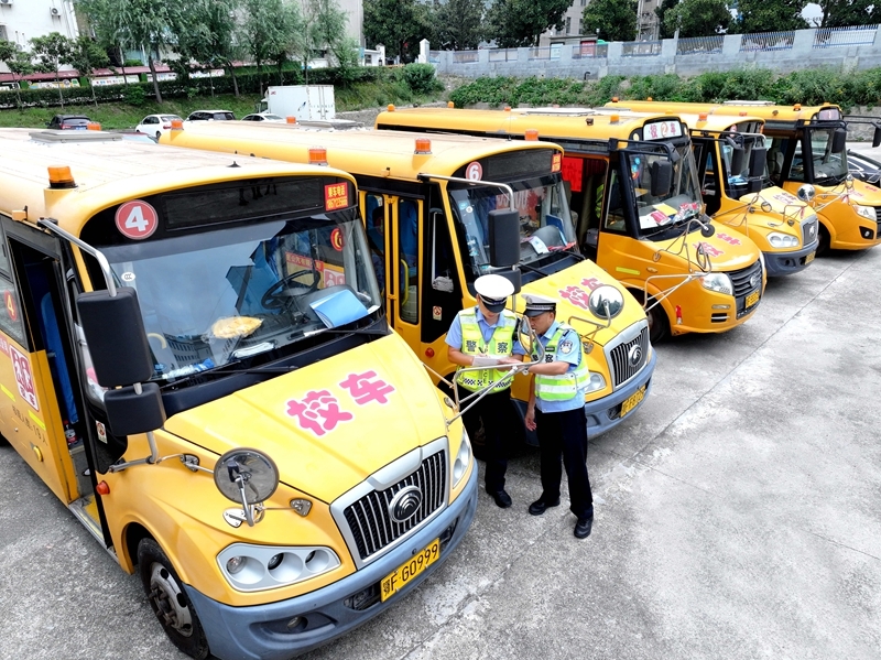 8月25日,湖北省襄陽市??悼h公安局交警大隊民警對校車進(jìn)行安全檢查(無人機照片)。