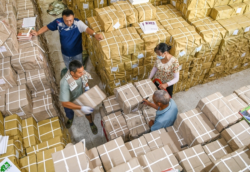 8月25日,在湖南省永州市道縣新華書店倉庫,工作人員在搬運新學(xué)期教材。