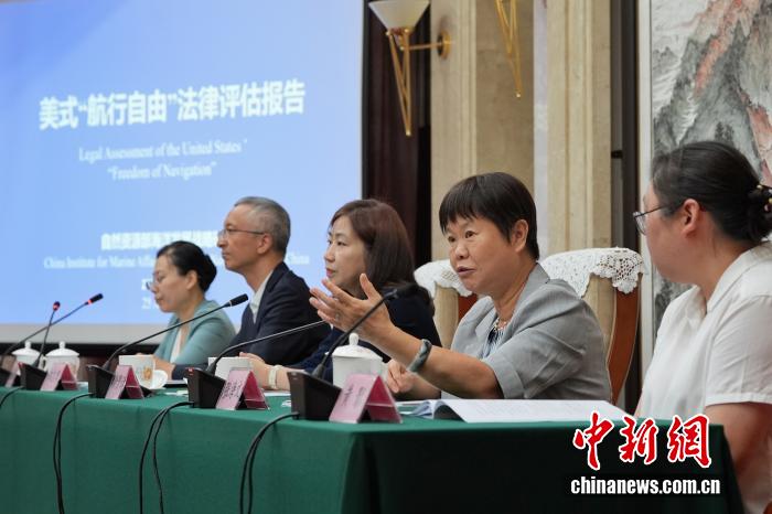8月25日,中國自然資源部海洋發(fā)展戰(zhàn)略研究所在北京發(fā)布《美式“航行自由”法律評估報告》中英文版。該《報告》旨在對美國“航行自由”相關(guān)主張和實踐是否符合國際條約和一般國際法、是否具備法律基礎(chǔ)進(jìn)行評估。圖為自然資源部海洋發(fā)展戰(zhàn)略研究所前所長張海文(右二)答記者問。中新社記者 張祥毅 攝