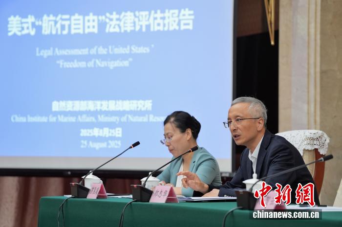8月25日,中國自然資源部海洋發(fā)展戰(zhàn)略研究所在北京發(fā)布《美式“航行自由”法律評估報告》中英文版。該《報告》旨在對美國“航行自由”相關(guān)主張和實踐是否符合國際條約和一般國際法、是否具備法律基礎(chǔ)進(jìn)行評估。圖為上海交通大學(xué)日本研究中心副教授鄭志華(右)答記者問。中新社記者 張祥毅 攝