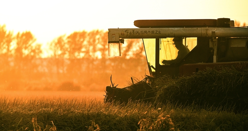 10月3日,農(nóng)戶在北大荒集團(tuán)黑龍江八五六農(nóng)場(chǎng)有限公司第五管理區(qū)搶收水稻(無人機(jī)照片)。