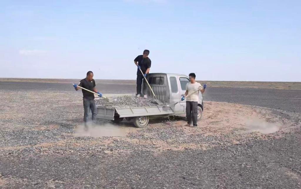 “看到車輪碾過標(biāo)語那一刻,就像碾在歷史的脊梁上。”網(wǎng)絡(luò)博主陸遙得知標(biāo)語被破壞后,主動驅(qū)車兩千多公里,經(jīng)歷六天抵達哈密。他和朋友們拉運20噸砂石,才終于修復(fù)這些“疤痕”。