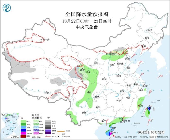 10月22日8時至23日8時,新疆南疆盆地和西部山區(qū)、西藏西部和東部、青海東部和南部、甘肅西南部、河北北部等地部分地區(qū)有小到中雪或雨夾雪;海南島、臺灣島北部、廣東雷州半島等地部分地區(qū)有大到暴雨,其中,海南島東南部、臺灣島北部等地部分地區(qū)有大暴雨,局地特大暴雨(250~260毫米)。新疆北部和東部、西藏中北部、青海西南部、甘肅西部、遼東半島、山東半島、福建東部、廣東南部、廣西南部、海南島等地部分地區(qū)有5~6級風,陣風7~8級;黃海南部海域、東海北部海域、北部灣、瓊州海峽將有7~8級、陣風9~10級的大風,東海南部海域、臺灣海峽、臺灣以東洋面、巴士海峽、南海北部和中西部海域?qū)⒂?~10級、陣風11~12級的大風。