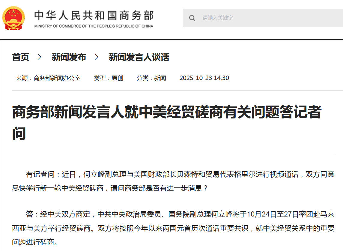 有記者問:近日,何立峰副總理與美國財政部長貝森特和貿易代表格里爾進行視頻通話,雙方同意盡快舉行新一輪中美經(jīng)貿磋商,請問商務部是否有進一步消息?