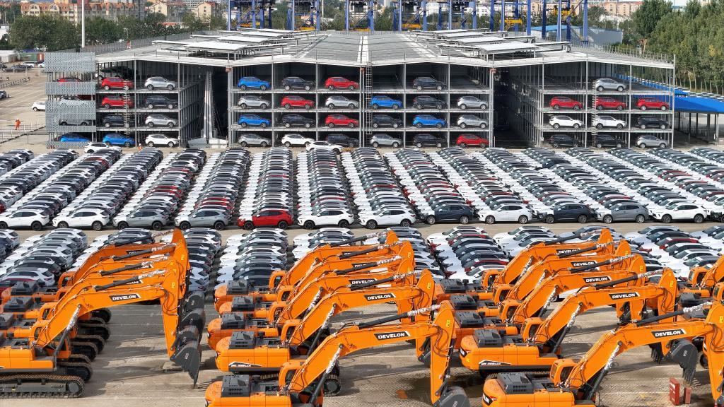 △山東港口煙臺港,國產(chǎn)汽車和工程機械集結等待裝船出口。