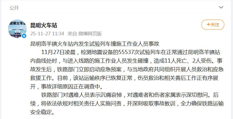 據(jù)昆明鐵路局昆明站官方微博消息,11月27日凌晨,檢測地震設(shè)備的55537次試驗(yàn)列車在正常通過昆明洛羊鎮(zhèn)站內(nèi)曲線處時,與進(jìn)入線路的施工作業(yè)人員發(fā)生碰撞,造成11人死亡、2人受傷。事故發(fā)生后,鐵路部門立即啟動應(yīng)急預(yù)案,與當(dāng)?shù)卣餐M織開展人員救治和應(yīng)急救援工作。目前,該站運(yùn)輸秩序已恢復(fù)正常,傷員救治和相關(guān)善后工作正有序展開,事故詳細(xì)原因正在調(diào)查中。