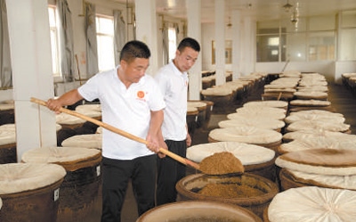 一旁,28歲的學(xué)徒李君正把缸里的醋醅翻到另一個(gè)醋缸之中。這是為了降溫而進(jìn)行的“打平翻缸”操作,要持續(xù)15天時(shí)間?!八螏煾嫡f(shuō),發(fā)酵環(huán)節(jié)最難掌握的就是溫度的控制和時(shí)機(jī)?!币郧胺N地為生的李君,已經(jīng)跟著宋俊鵬學(xué)了5年釀醋,一個(gè)月有將近4000元的收入,“學(xué)會(huì)獨(dú)門(mén)技藝,咱也是手藝人了!”