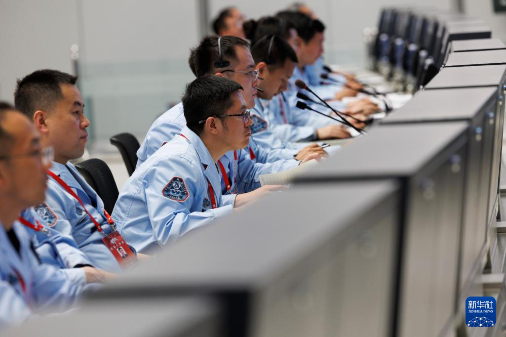 4月24日在北京航天飛行控制中心拍攝的神舟二十號(hào)載人飛船成功對(duì)接空間站天和核心艙畫(huà)面。新華社記者 金立旺 攝