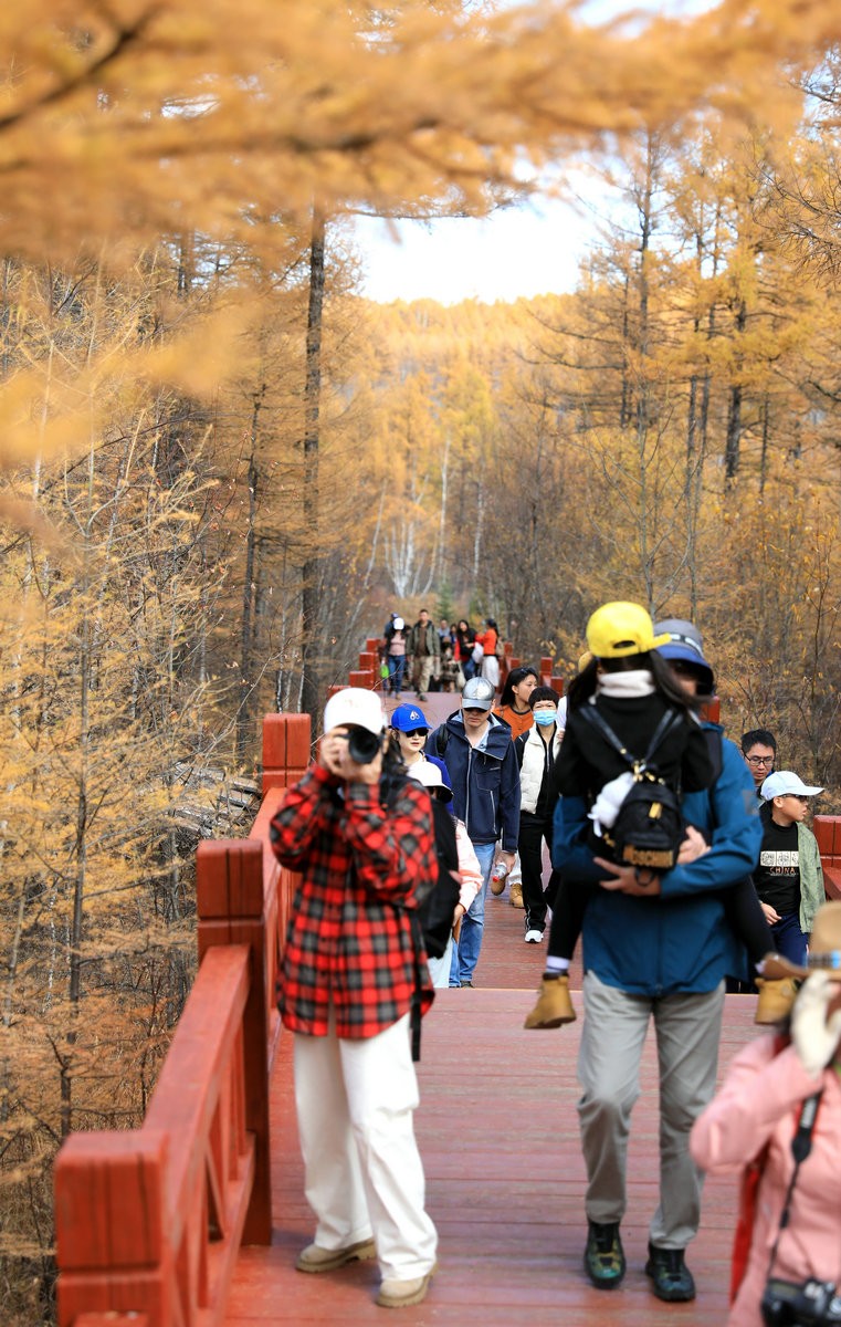 9月29日,游客在內(nèi)蒙古阿爾山國家森林公園三潭峽欣賞秋色 北疆新聞記者 張楊攝影