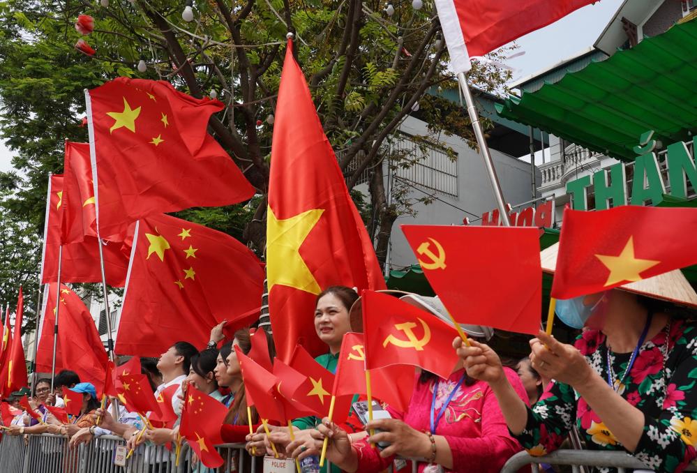 歡迎儀式后,習(xí)近平和蘇林一同步行前往越共中央駐地舉行會(huì)談。沿途數(shù)百名越南民眾揮舞兩黨兩國(guó)旗幟,對(duì)習(xí)近平表示最熱烈的歡迎。習(xí)近平向歡迎人群揮手致意。