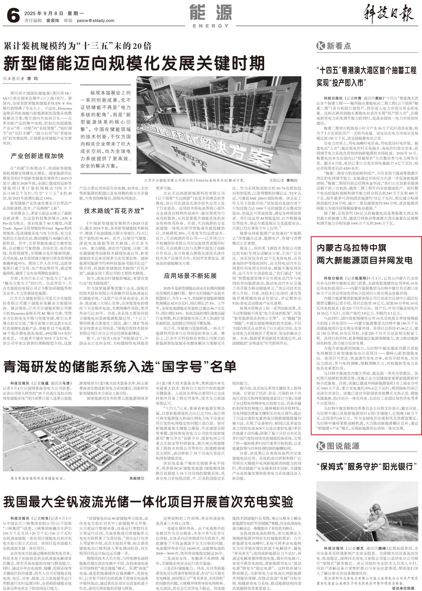 2025年9月8日,《科技日?qǐng)?bào)》第6版整版刊發(fā)題為《內(nèi)蒙古烏拉特中旗兩大新能源項(xiàng)目并網(wǎng)發(fā)電》的文章,報(bào)道了記者從內(nèi)蒙古巴彥淖爾市烏拉特中旗相關(guān)部門(mén)獲悉,全國(guó)首批規(guī)模性應(yīng)用單機(jī)10兆瓦風(fēng)電機(jī)組項(xiàng)目——內(nèi)蒙古能源集團(tuán)烏拉特中旗甘其毛都口岸50萬(wàn)千瓦靈活性綠色供電示范項(xiàng)目日前實(shí)現(xiàn)全容量并網(wǎng)。