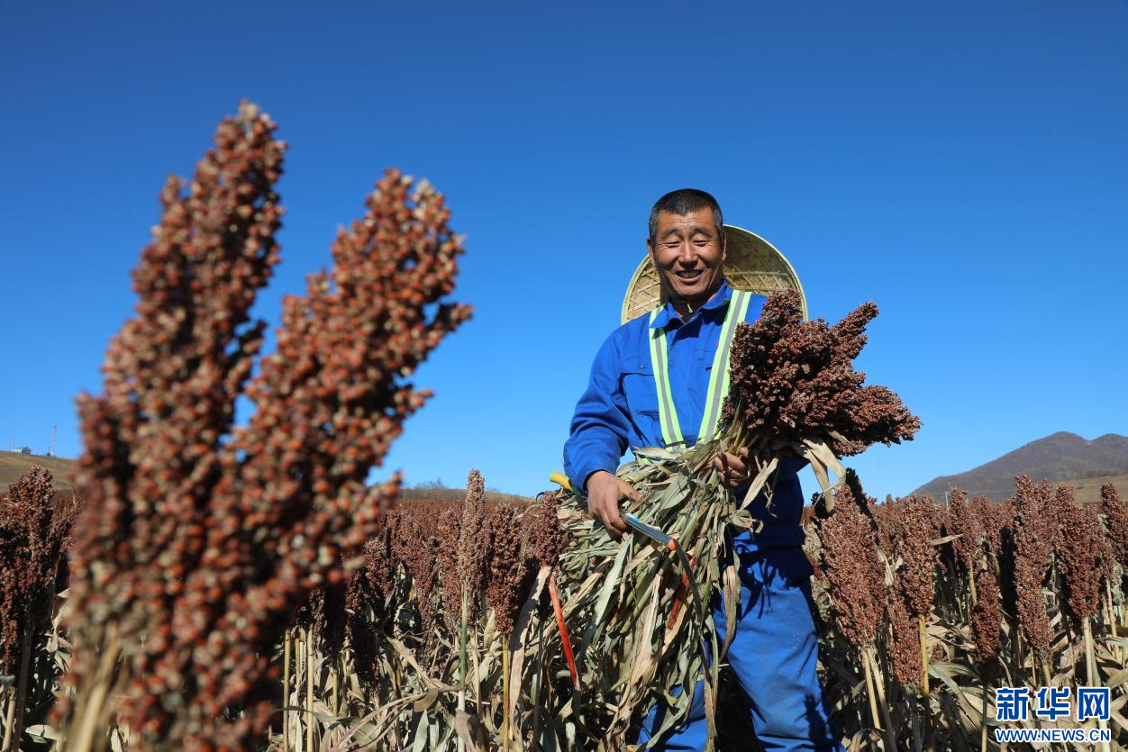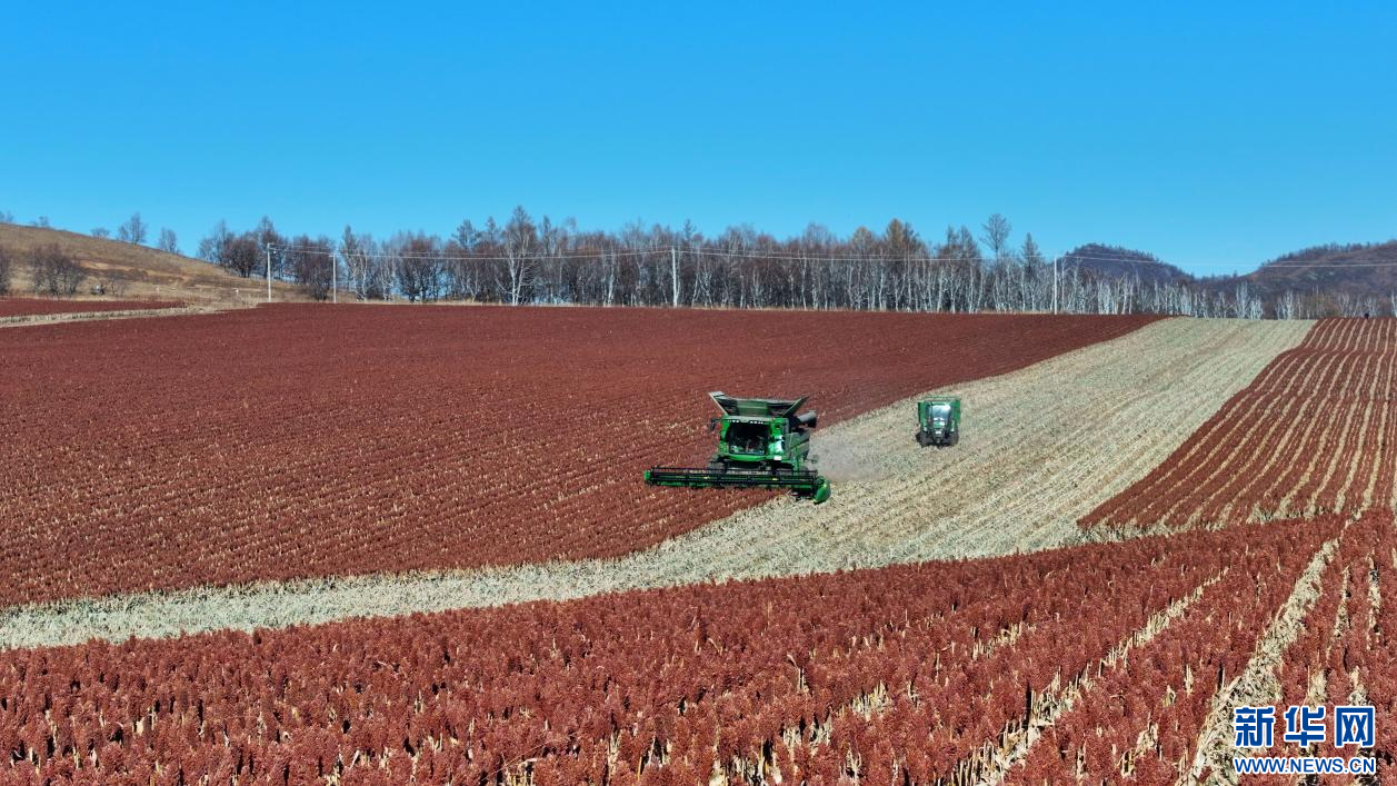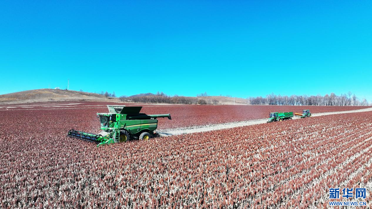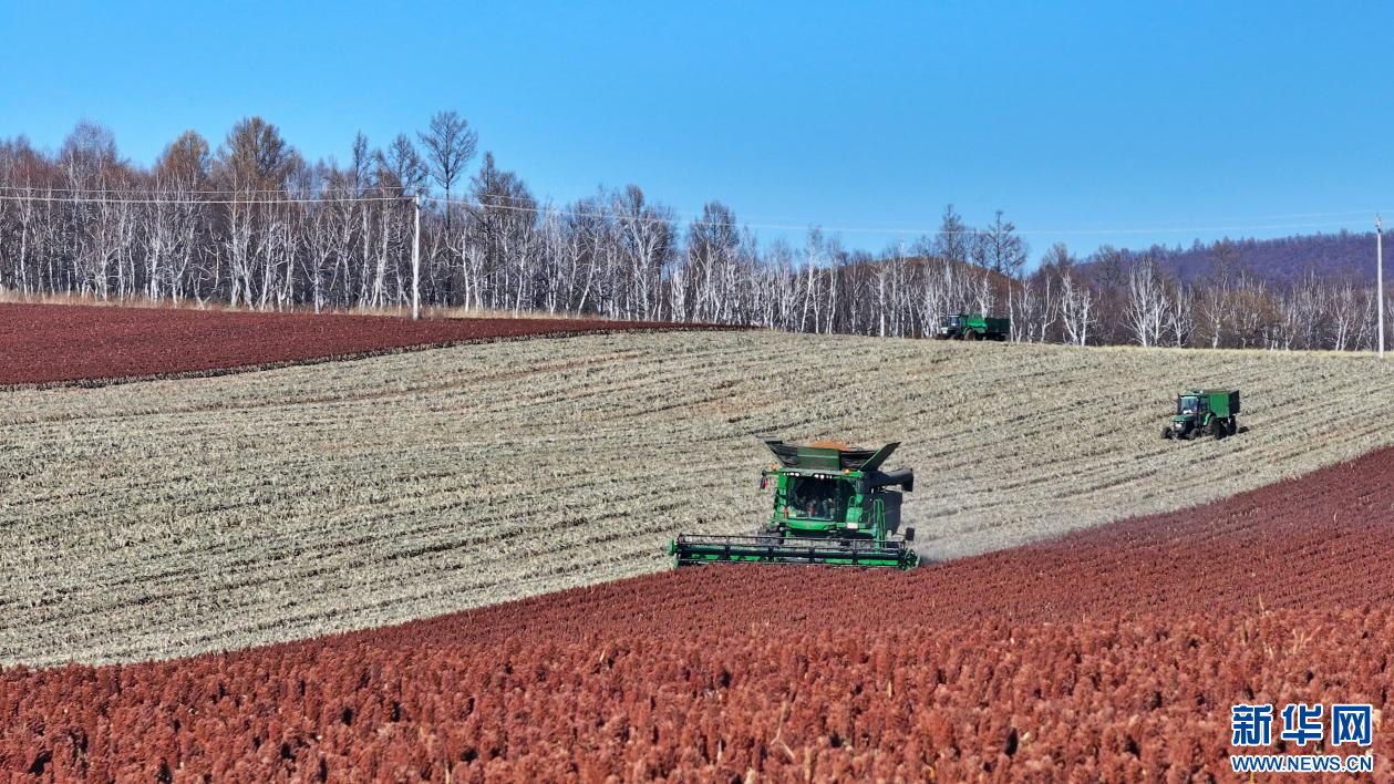??10月22日,在內(nèi)蒙古自治區(qū)呼倫貝爾農(nóng)墾綽爾河農(nóng)牧場(chǎng)有限公司田間,農(nóng)場(chǎng)員工正在收獲高粱。新華網(wǎng)發(fā)(哈園碩 攝)