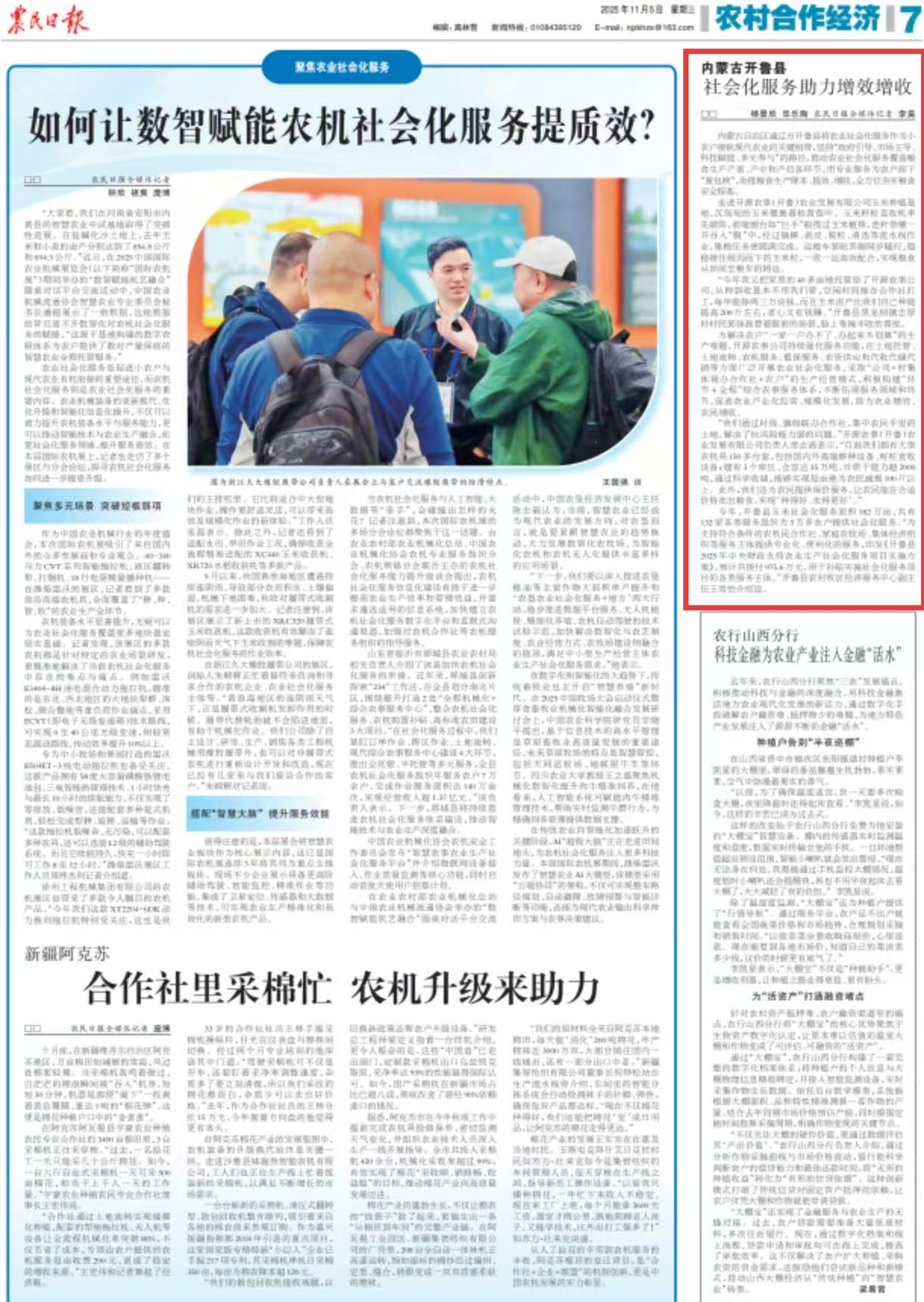 2025年11月5日,《農(nóng)民日?qǐng)?bào)》第7版刊發(fā)題為《內(nèi)蒙古開魯縣:社會(huì)化服務(wù)助力增效增收》的文章,報(bào)道了今年以來,內(nèi)蒙古開魯縣玉米社會(huì)化服務(wù)面積182萬畝,共有132家各類服務(wù)組織為3萬多農(nóng)戶提供社會(huì)化服務(wù)。